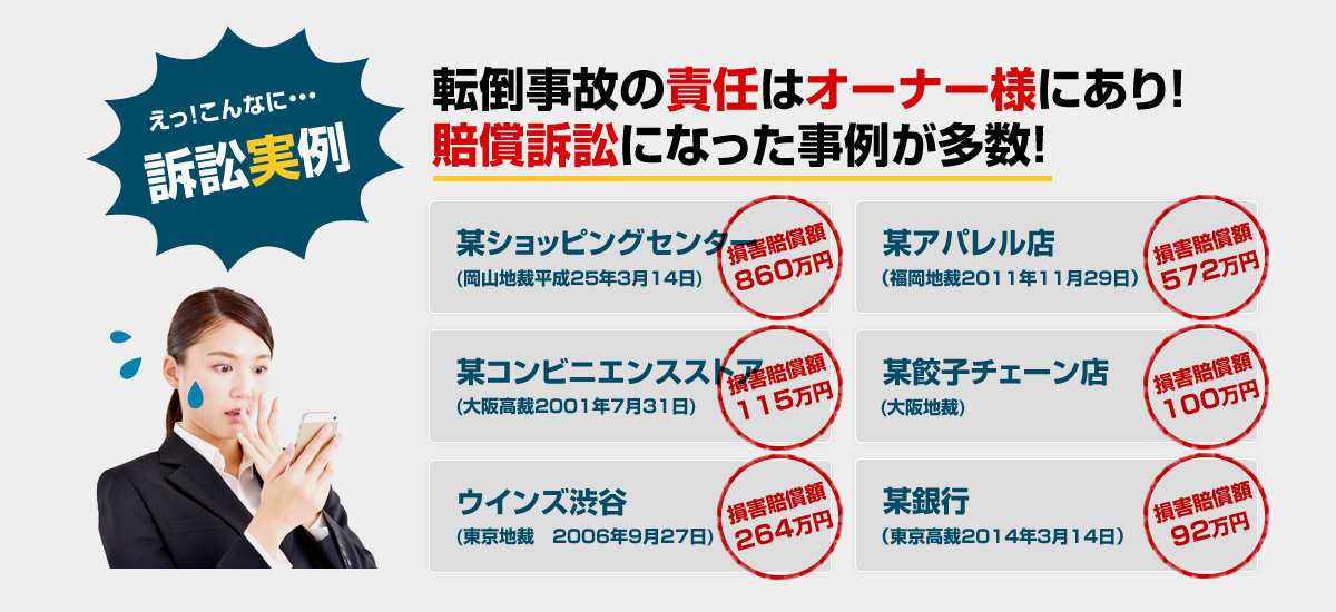 バリアフリー新法が改定された今、あなたの管理する建物で、転倒による事故が起きると、責任はオーナーにあり、損害賠償を請求されてしまいます。